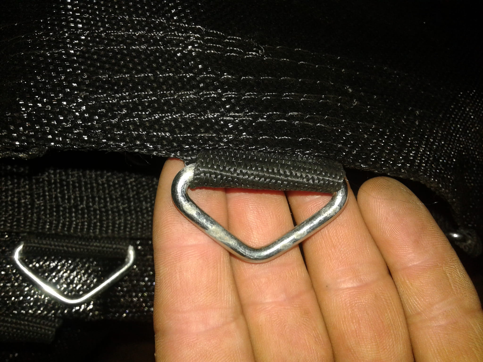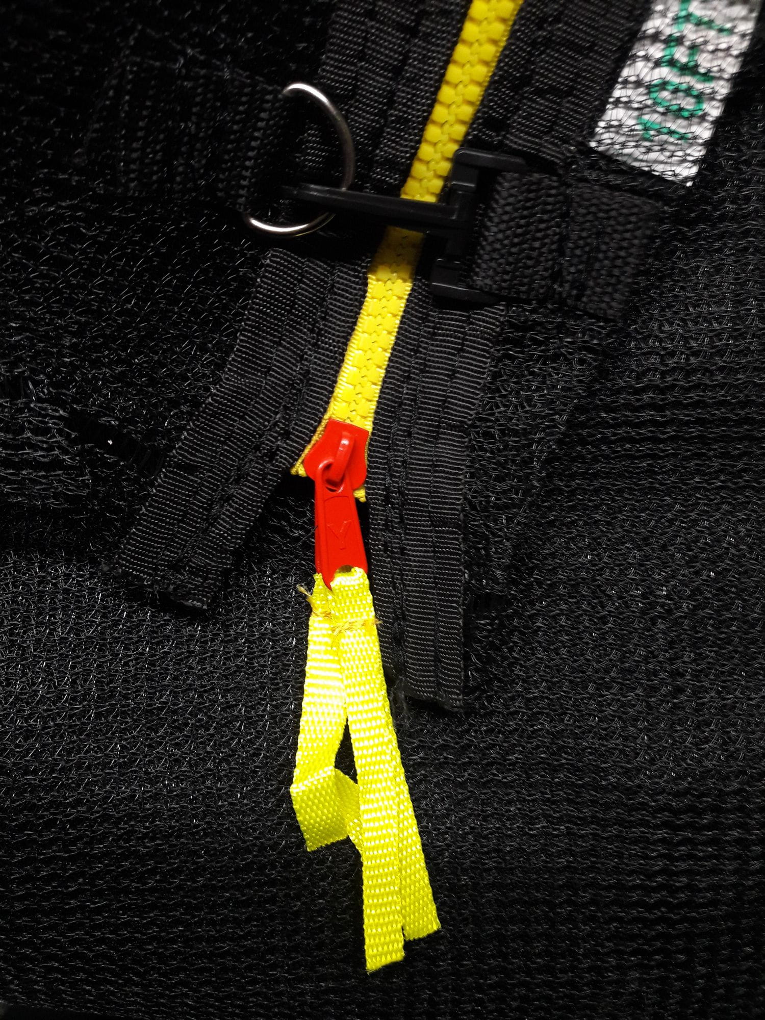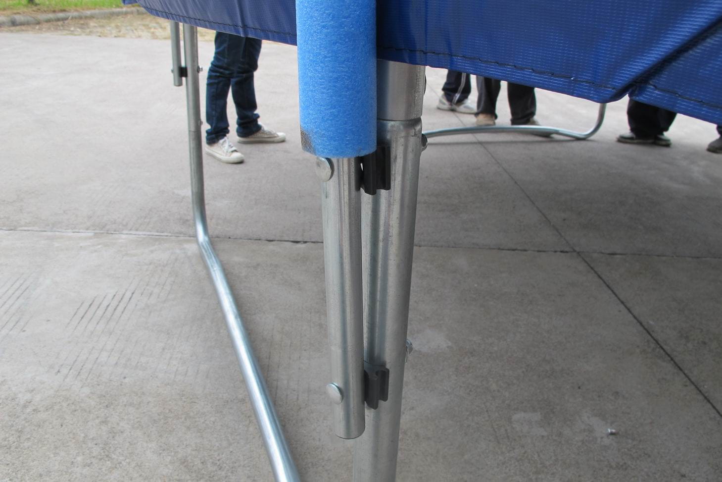 Siatka ma u dołu otwory, przez które przeplatamy sznurek mocujący siatkę do metalowych trójkątów maty do skakania.